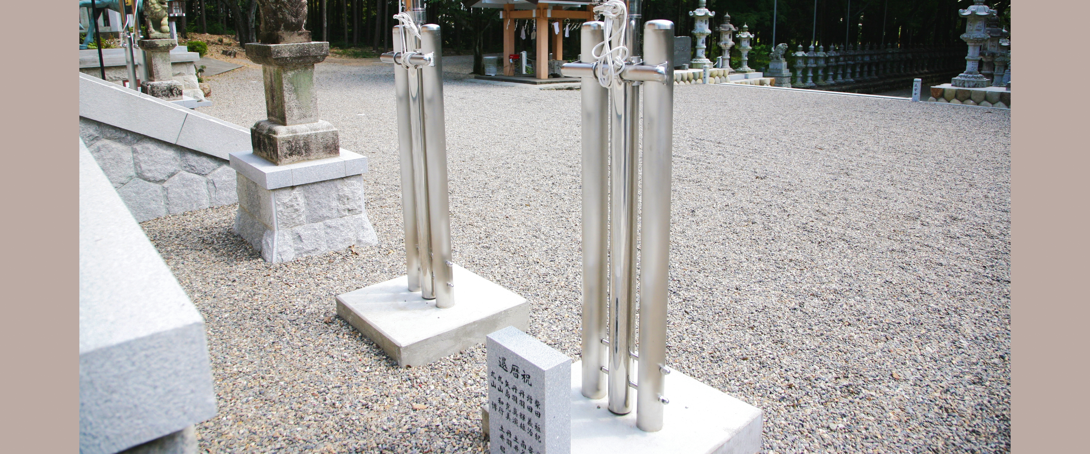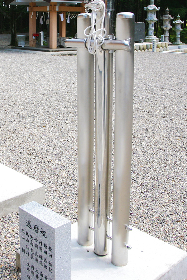 当社の門柱式は取りはずしができ、美観も優れ神社によく合い好評を得ています。埋込式、石柱止め式ご相談下さい。 門柱式は地上1m高さで止めるので強度があります。